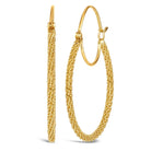 18 karat yellow gold “Stardust” hoops. The hoop earrings have a twisted cable structure with curved posts that snap into place. They are the medium size measuring approximately 1″ in diameter. The style number is E-1553(M).