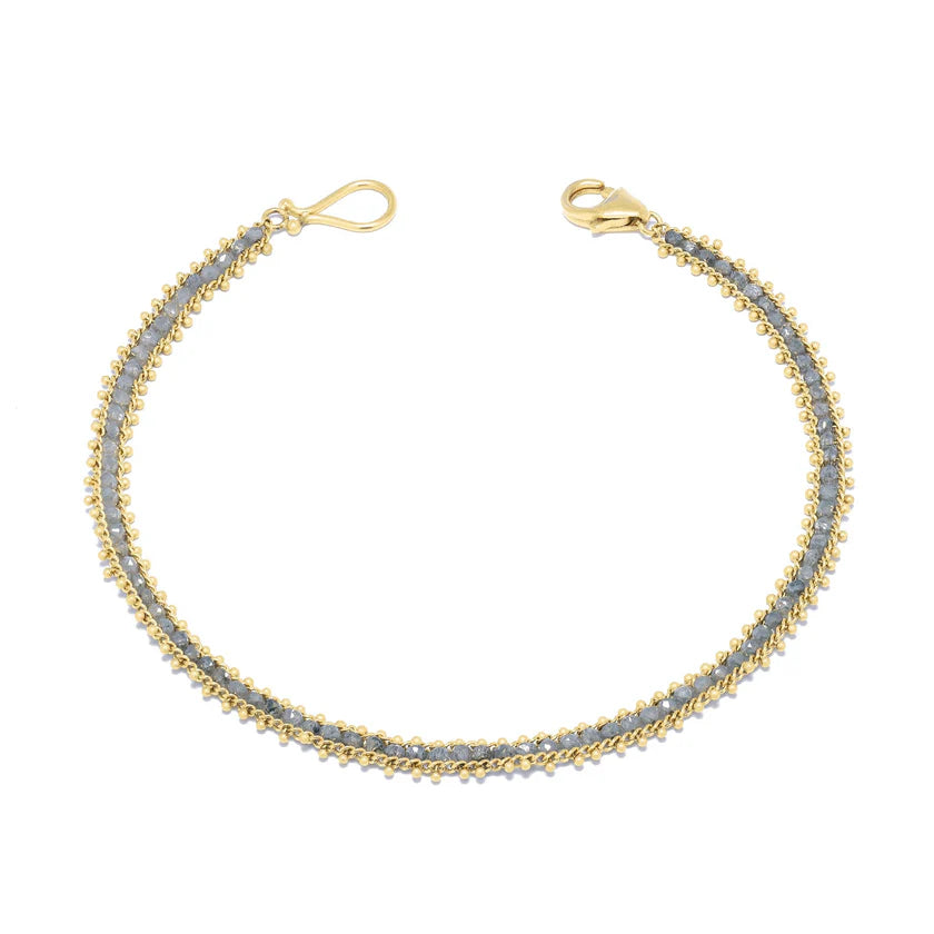 18 karat yellow gold and grey diamond textile line bracelet designed and created by Amali. The bracelet features round faceted grey diamonds woven into an 18 karat yellow gold textile line. The bracelet has a lobster claw clasp. The style number is B-1303-GD.