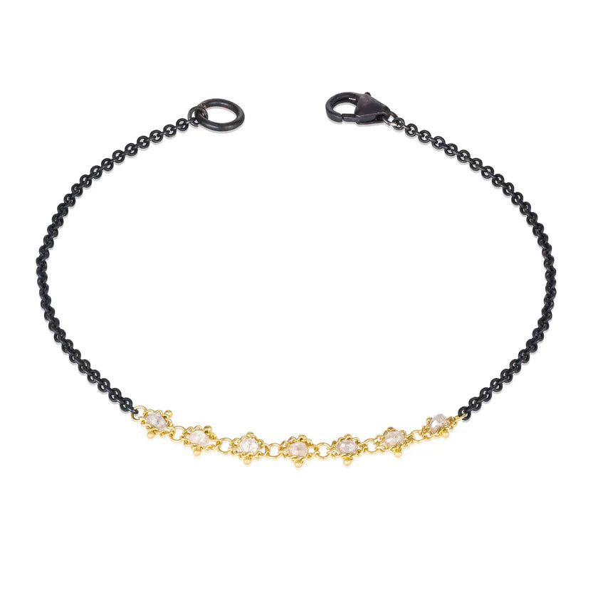Oxidized sterling silver, 18 karat yellow gold and silver diamond bracelet designed and created by Amali. The bracelet is composed of oxidized sterling silver with a section of silver diamond beads woven into 18 karat yellow gold in Amali's signature textile style. The bracelet has a lobster clasp closure and the style number is B-1602-SD.