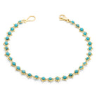 18 karat woven yellow gold and turquoise bead bracelet. Each turquoise bead individually pinned with chain woven throughout to finished length of 6.25 inches. The closure features a lobster style clasp. Style B-1101-TQ