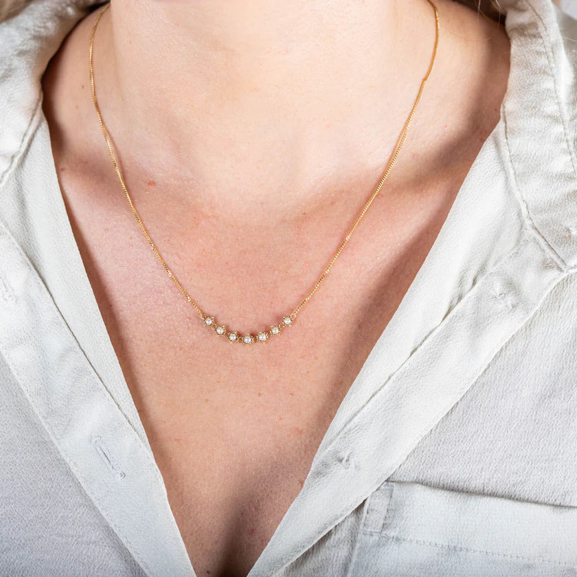 18 karat yellow gold and pearl textile necklace designed and created by Amali. The necklace features freshwater pearl beads (weighing approximately .65 carats) woven into Amali's signature textile style. The necklace is finished in a high polish. The style number is N-1002-P