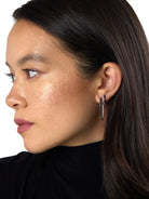 18 karat blackened gold black diamond snap hoops designed and created by Melissa Kaye. The earrings are a marquis shaped hinged hoop with hinge at base and post at the top. There are round brilliant cut black diamonds pave set in a line on front and front of back of earring. The black diamonds together weigh 1.54 carats. The earrings measure 30mm in length. Style reference Cristina Earring E1310B.