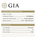 18 karat yellow gold diamond solitaire engagement ring designed and created by Mark Patterson. The ring features a round circular brilliant cut diamond set in six claw prongs above a thin high polish shank. The diamond is accompanied by a GIA report #5231889020 which indicates the diamond is K color, VS2 in clarity and weighs 3.40 carats. The report also indicates the diamond has No Fluorescence. The ring is a finger size 6 and the style number is R1095Y.