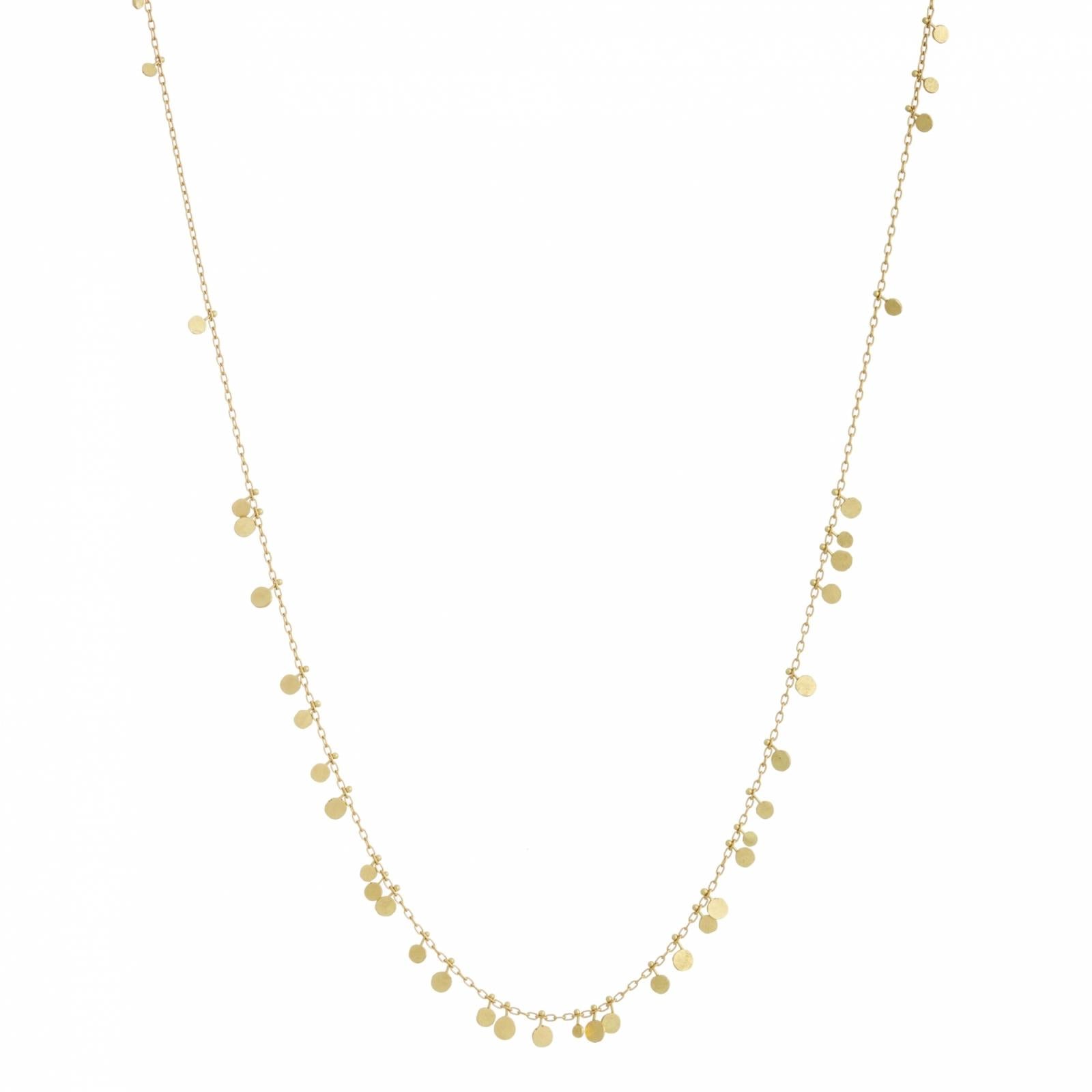 18 karat yellow gold "Long Random Dots Necklace" by Sia Taylor. The necklace features hand fabricated small discs of 18 karat yellow gold placed randomly along a 53.5cm cable chain. The necklace is 21" in length and has a circle spring clasp. The style number is DN32Y.