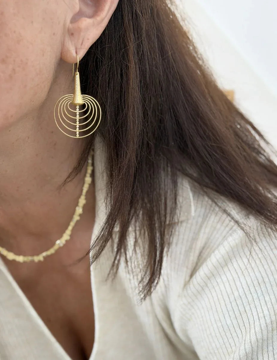 One pair of hand forged 18k yellow gold earrings designed and created by Todd Reed. The earrings feature strips of concentric gold with a line of brilliant cut diamonds down the center. There are 0.18ctw of diamond. The earrings are finished with Todd's signature texture.