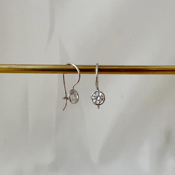18 karat white gold handmade diamond ear hooks, designed and created by Von Bargen’s. The earrings feature two round brilliant ideal cut diamonds that are set in handmade wire bezels. The diamonds together weigh 0.45 carats. They drop from a petite earwire that hooks into the backside of the diamond. Style reference E0002-S.
