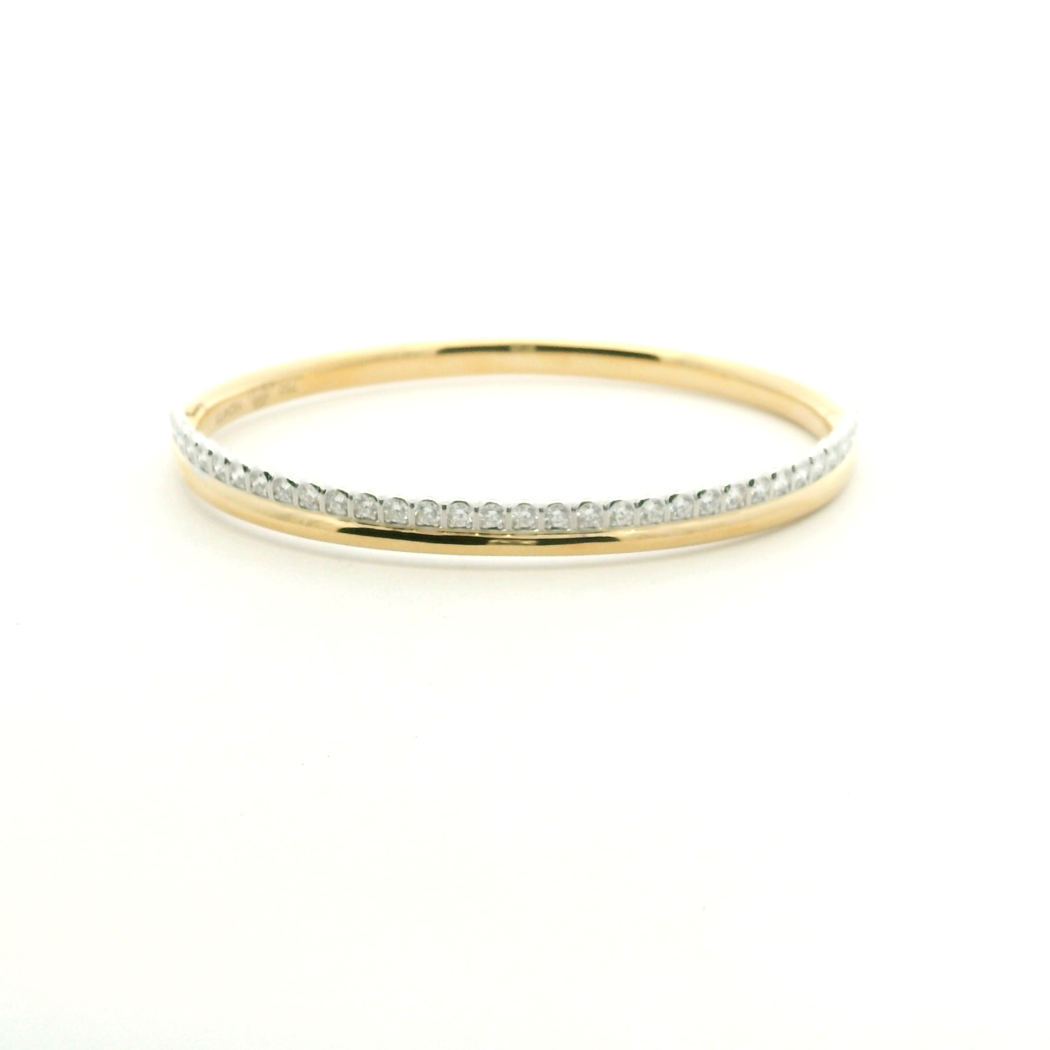 18 karat yellow and white gold diamond bracelet designed and created by Kwiat. The bracelet is a hinged oval bangle. It is created in 18 karat yellow gold in a high polish finish with a hinge at one side and a clasp and safety at the other. There is a white gold and diamond crown like second segment running along the top half of the bracelet. There are 33 round brilliant cut diamonds that together weigh 1.20 carats. They are G to H in color and VS2-SI1 in clarity. They are set with prongs inside a round white gold element. The style reference is B-19704-0-Dia-18TT.