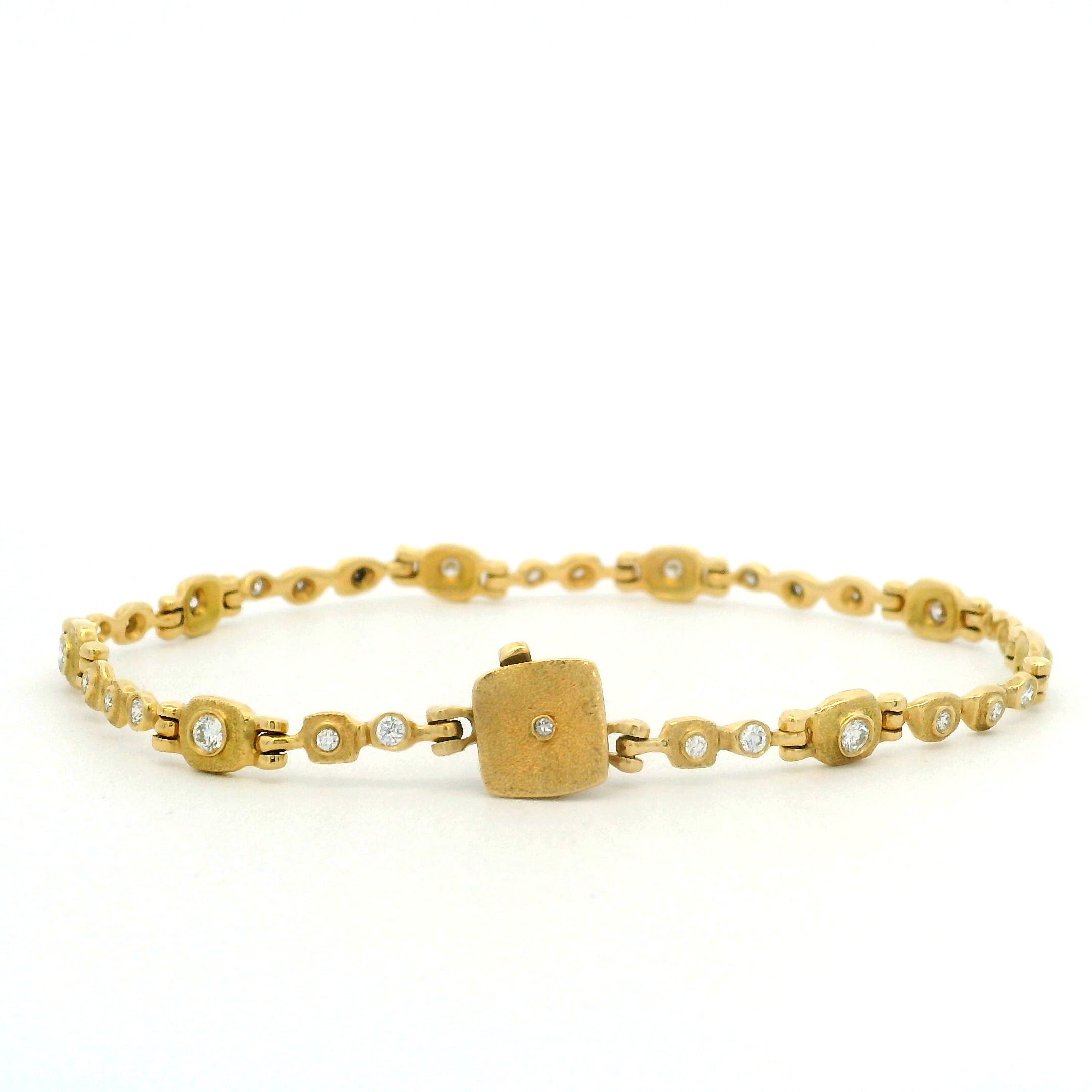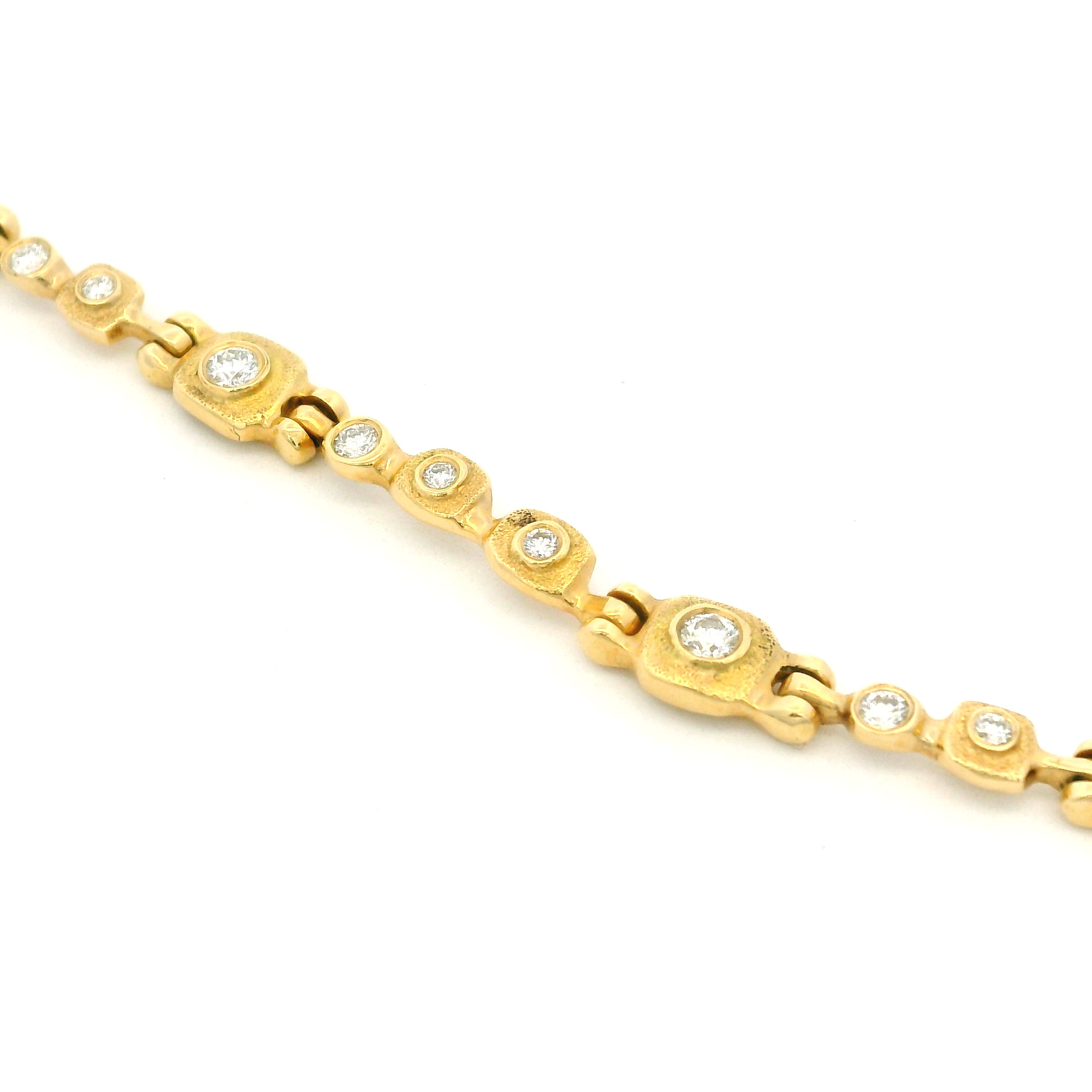 18 karat yellow gold and diamond bracelet designed and created by Audrius Krulis. The bracelet features 31 white diamonds set into linear hinged element. The diamonds together weigh 0.84 CT and are G-H in color and VS1 in clarity. The bracelet is 7.5″ in length. The clasp is a plunge and twist and is secured with a safety. The bracelet is finished in Krulis’ signature finish. Style AKB-27