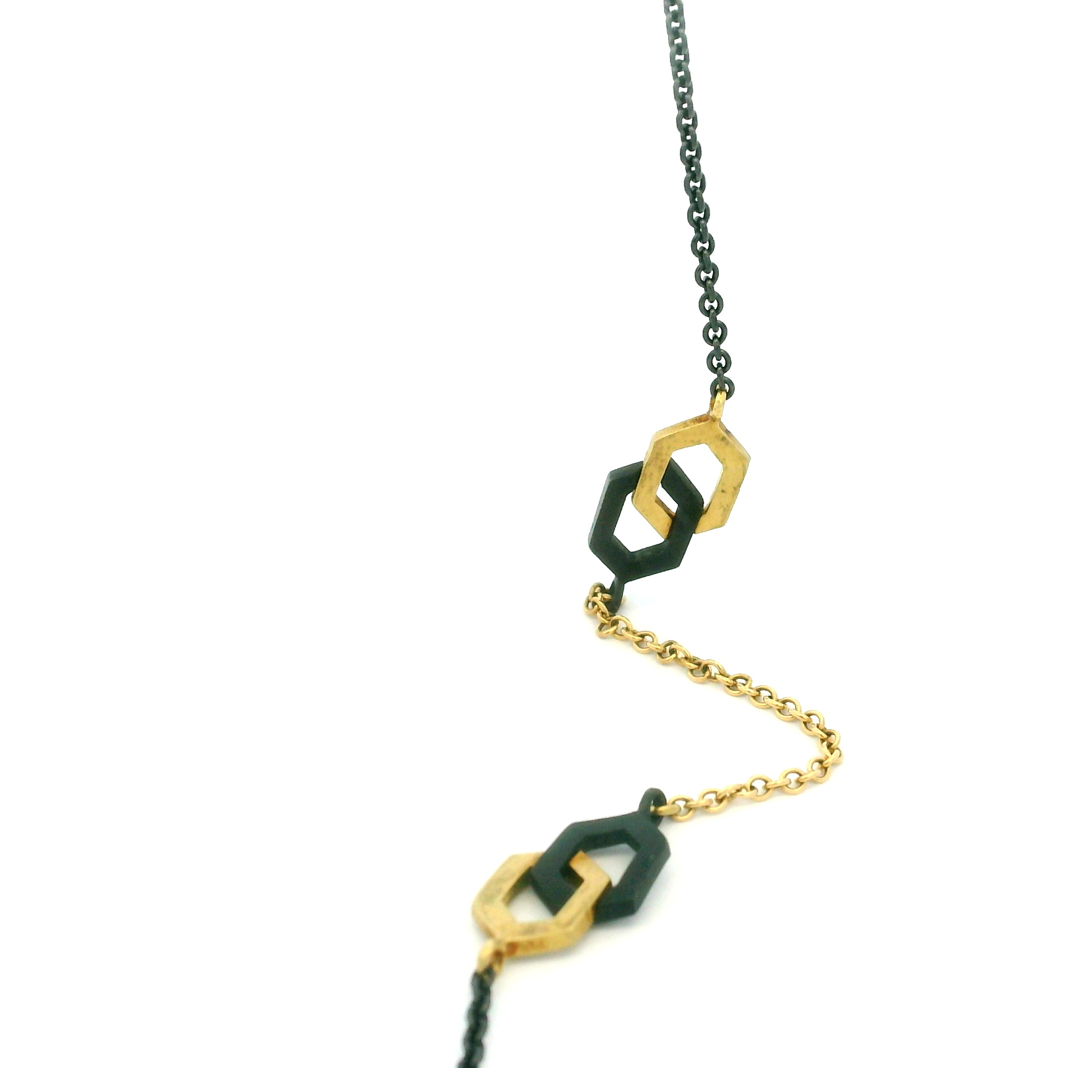 One 18k yellow gold and black stainless steel necklace designed and created by Sarah Graham. The necklace features seven hexagonal interlocking elements. The necklace is 20” long with 1.5mm cable chain alternating in color between yellow gold and black stainless steel. Style reference 66N12 GS