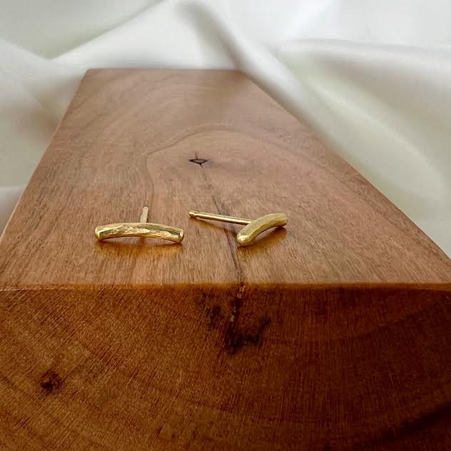 18 karat yellow gold handmade stud earrings designed and created by Von Bargen’s. The earrings are from the Studio Collection. The earrings feature a 10mm curved bar that has a hammered satin finish. The earrings are on a straight post with a friction back. Style reference EMM8.