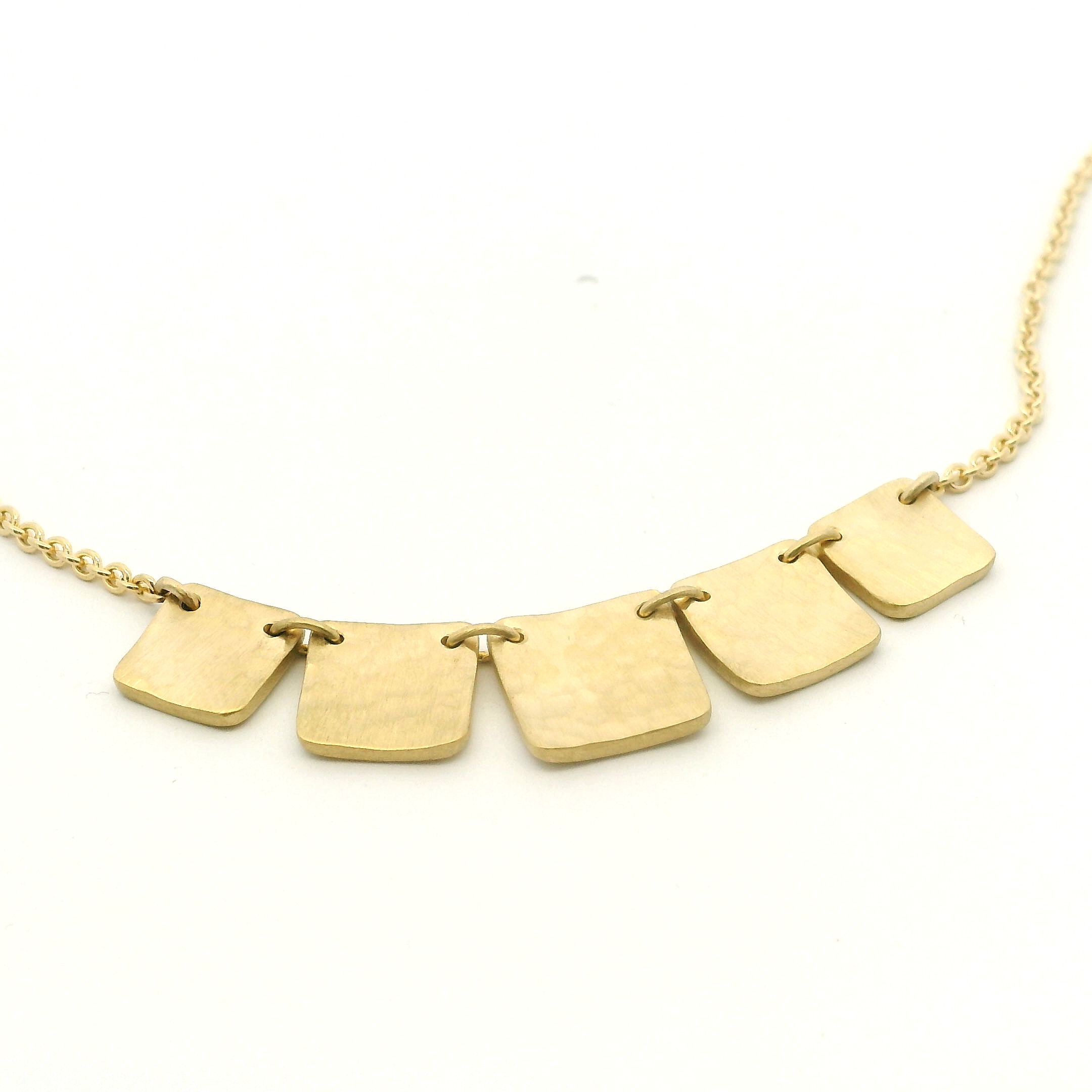 18 karat yellow gold fringe necklace designed and created by Von Bargen’s Jewelry. The necklace is from the Von Bargen’s Studio Collection. It features 5 hammered satin finished cushion shaped discs that are set along a cable chain. The cushions range in size from 10x10mm at center to 8x8mm at the ends. They are connected by 18 karat yellow gold oval jump rings. The chain is a cable chain measuring 16 inches in length. Style PMM15-Fringe.