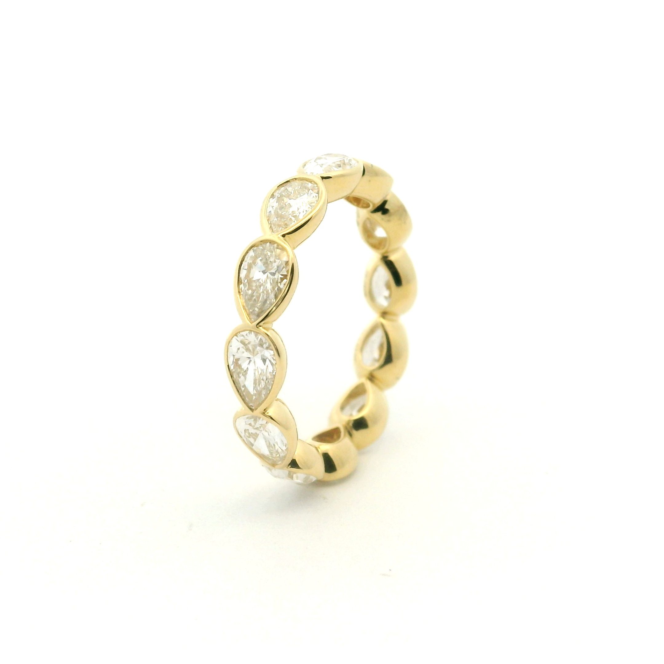 18 karat yellow gold pear shape diamond eternity band designed and created by Rahaminov. The ring features pear shape brilliant cut diamonds set east to west around the entire perimeter of the band. The diamonds together weigh 2.97 carats. They are set in bezels in high polished yellow gold. Style EB-2609.