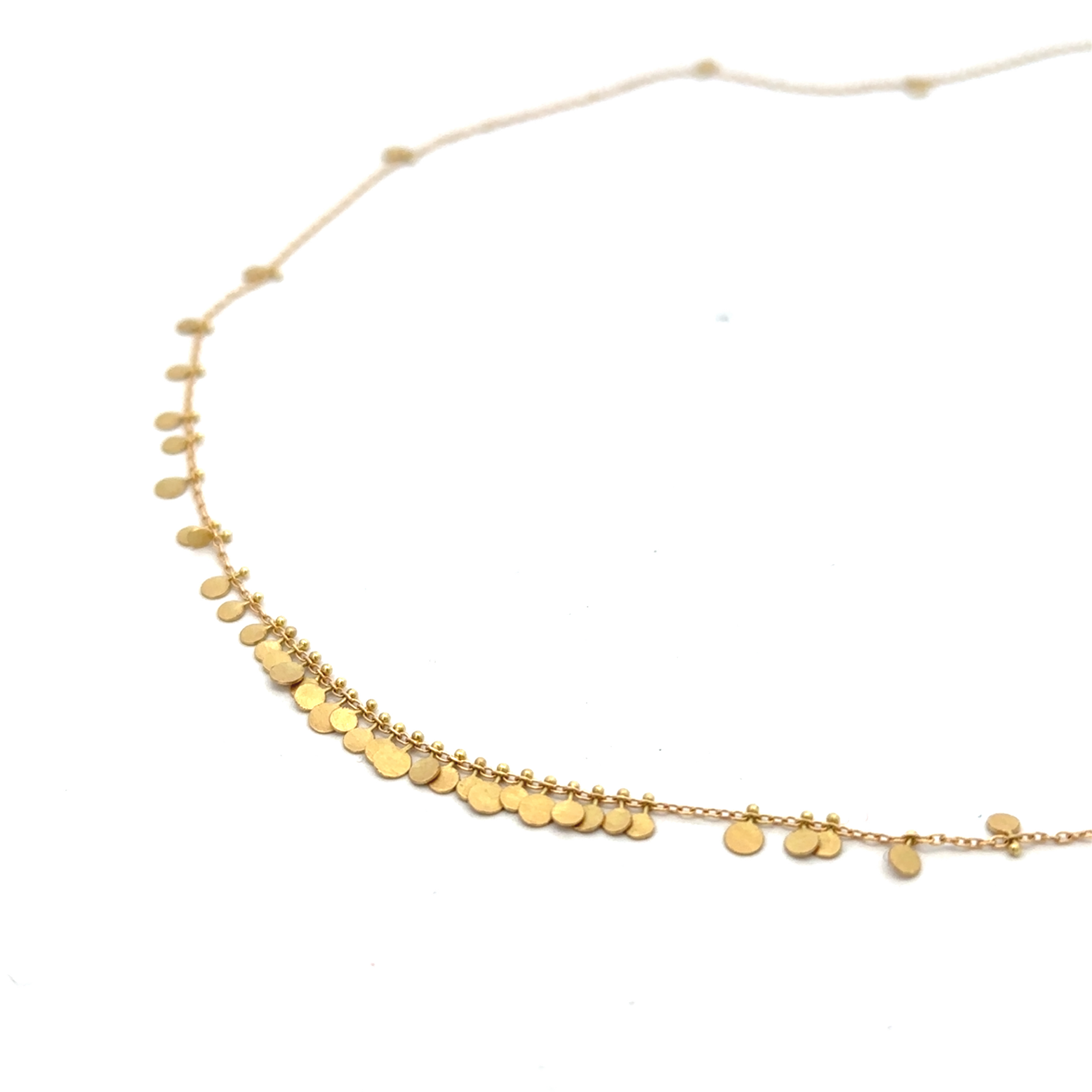 18 karat yellow gold Tiny Dots Cluster necklace designed and created by Sia Taylor. The necklace features tiny round elements arranged along a fine cable chain. The dots are set at even intervals along the chain until they cluster at the front. The chain measures 16.5″ in length. Style DN362Y.