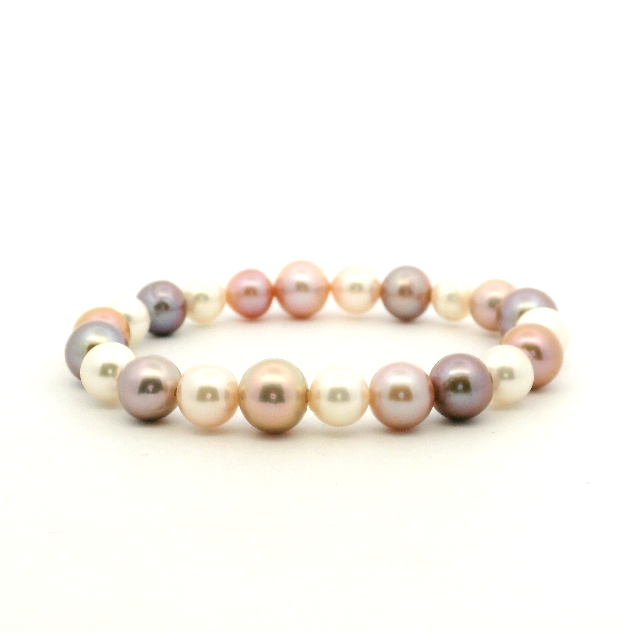 Pearl stretch bracelet designed and created by Gellner. The bracelet features 16 Akoya and Ming-cultured pearls in 7.5-8 mm sizes in white, pink and lavender colors. The style number is 5-24857-04