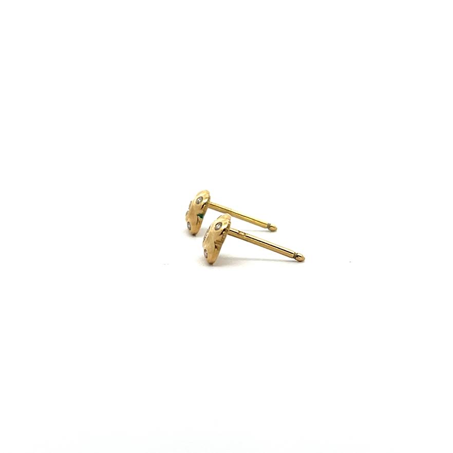 Diamond “Flora” stud earring designed and created by Alex Sepkus. The 18k yellow gold four-petal flower shaped earrings feature a center bezel set round brilliant cut diamond surrounded by four round brilliant cut diamonds, one bezel set in each petal (F-G, VVS, 0.24ctw). The earrings have posts with friction backs and are finished with Alex Sepkus’ signature hand-applied hammered texture.