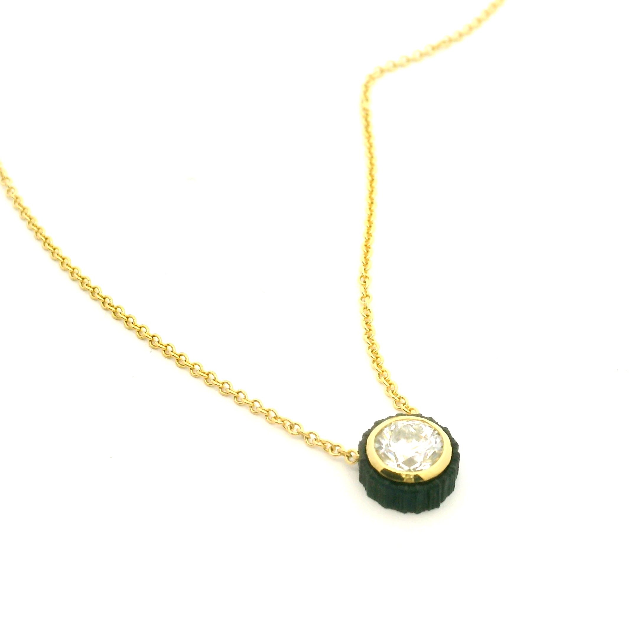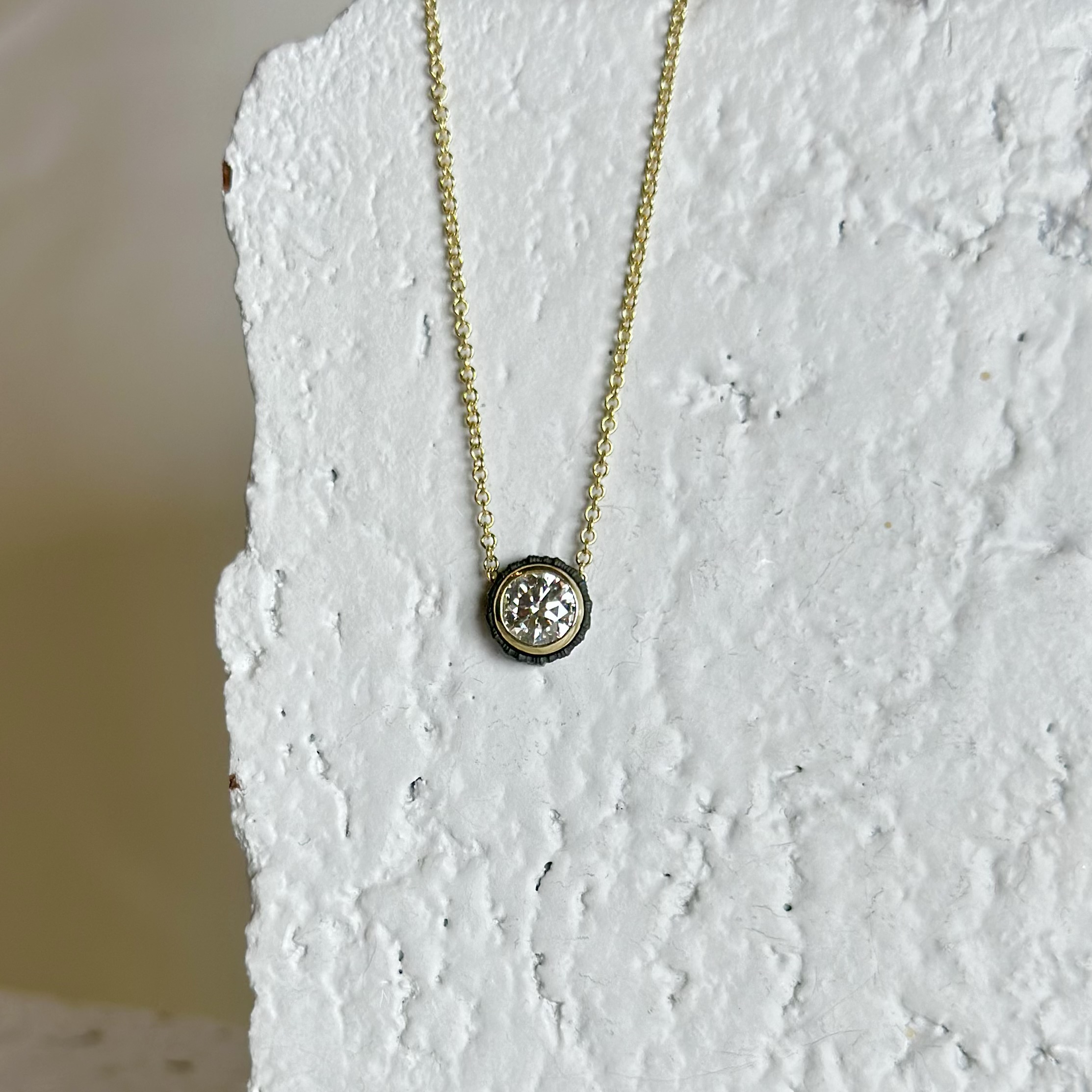 18 karat yellow gold and cobalt chrome diamond pendant designed and created by Sarah Graham. This pendant features a Von Bargen’s hand selected ideal cut diamond. The diamond is accompanied by a GIA diamond grading report, #6491747719, which indicates that it weighs 0.81 carat and is G in color and SI2 in clarity. The diamond has Excellent Cut, Polish and Symmetry and No Fluorescence. The diamond is set in an 18-karat yellow gold bezel with a blackened cobalt chrome sleeve. The pendant slides along an 18-karat yellow gold cable chain that measures 18 inches in length. Style reference 23P1-1-1GS.
