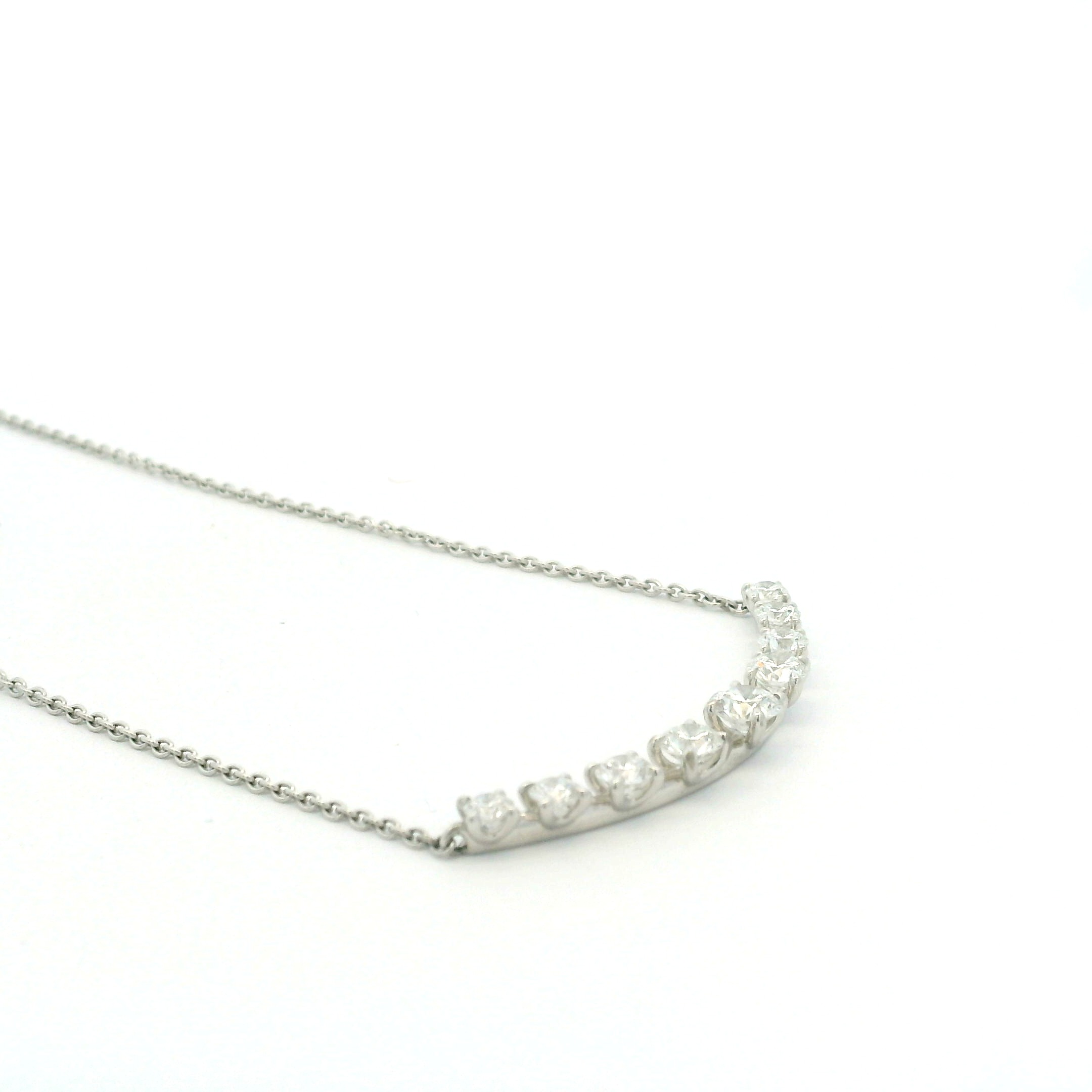 18 karat white gold demi riviera diamond necklace designed and created by Kwiat. The necklace features 9 round brilliant cut diamonds which graduate to the center. The diamonds are set in four prong baskets that sit along a white gold crescent shape. The diamonds together weigh 1.03 carats and are G to H in color and VS2-SI1 in clarity. The crescent is married on each side to a white gold cable chain that is finished with a lobster clasp. The necklace measures 17 inches in length. Style reference N-9839.