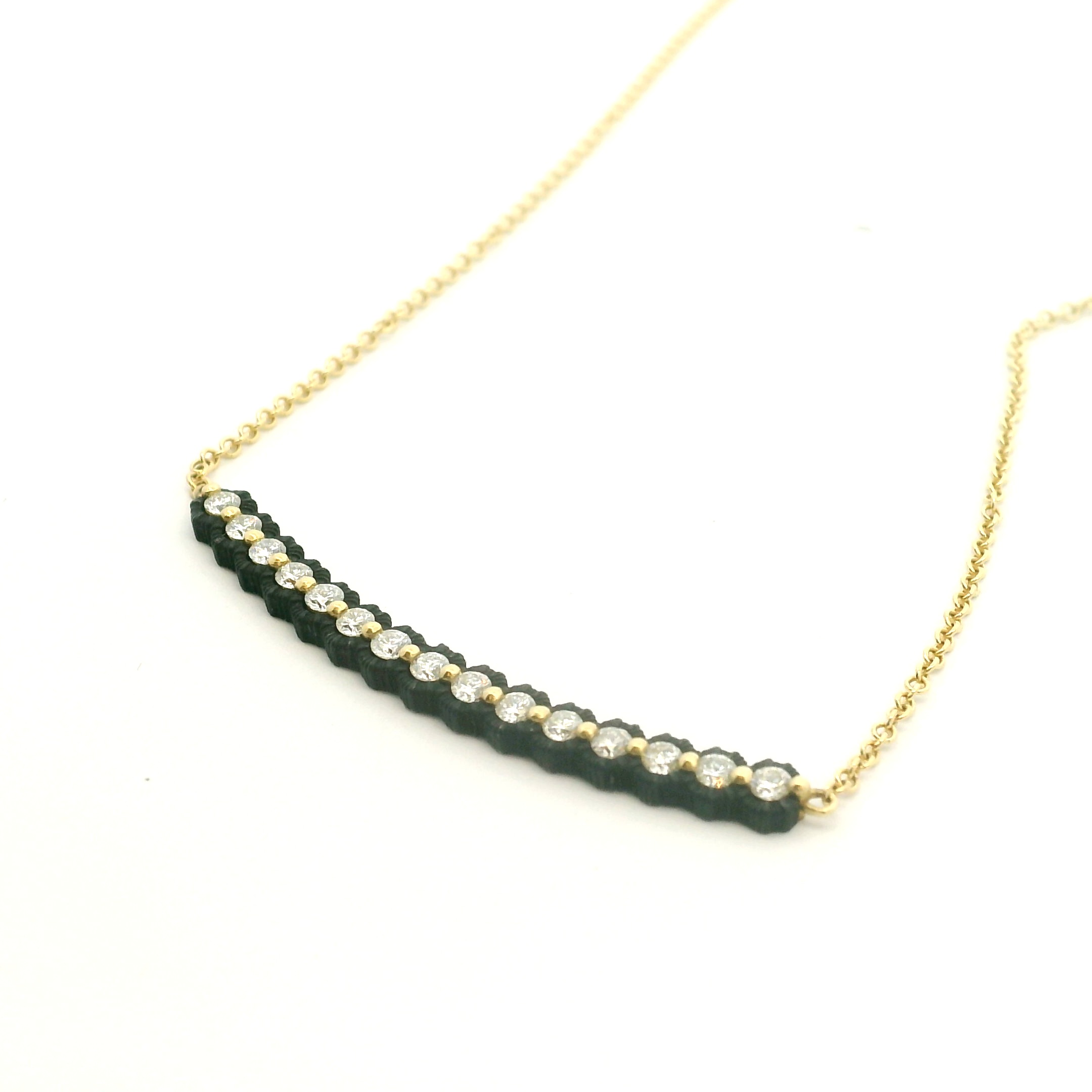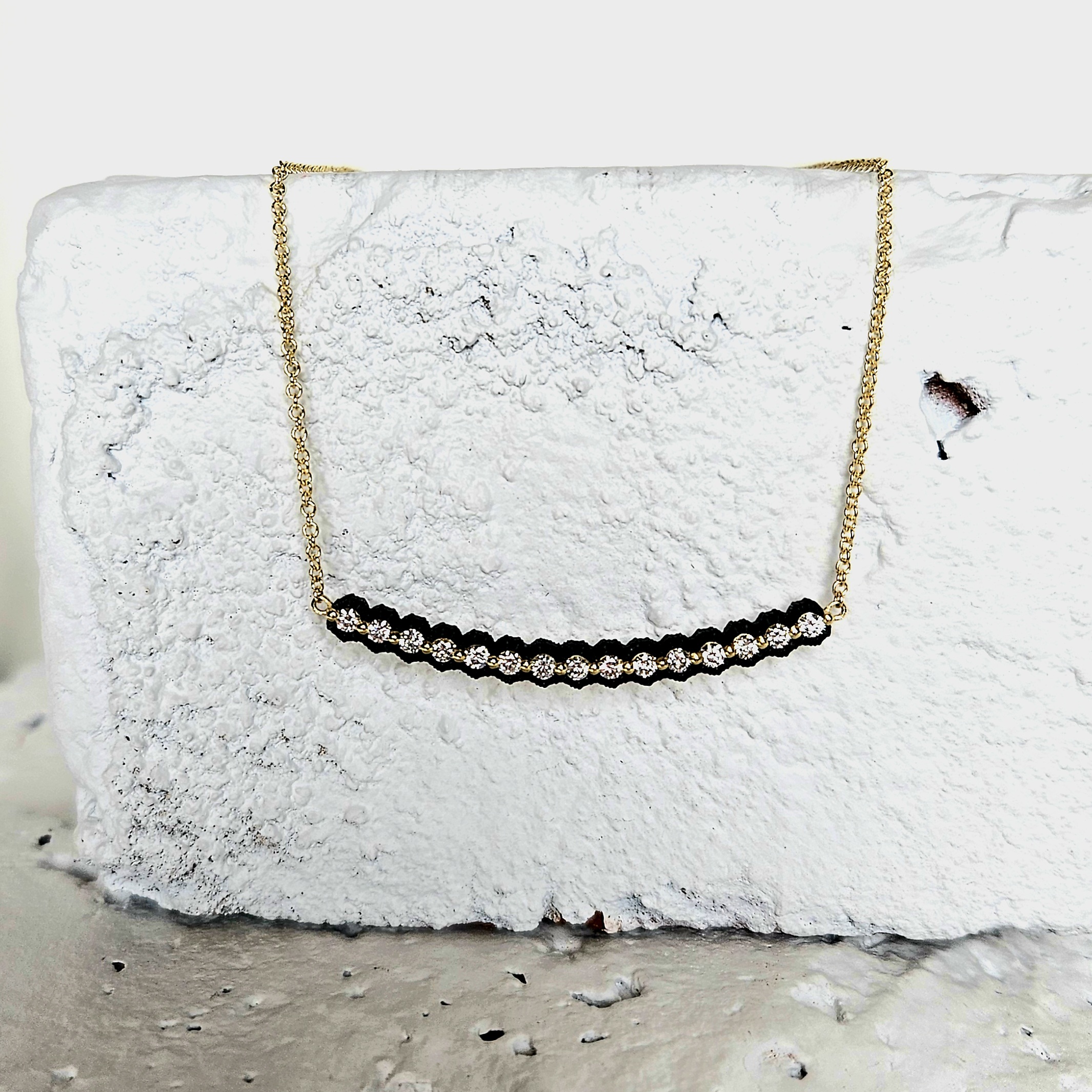 One 18k yellow gold, cobalt chrome and diamond necklace designed and created by Sarah Graham metalsmithing. This piece features round brilliant cut diamonds set into a slightly curved oxidized cobalt chrome bar. There is a chain that attaches to each end and is secured with a lobster clasp. This necklace is 16in long with a loop at 15in.