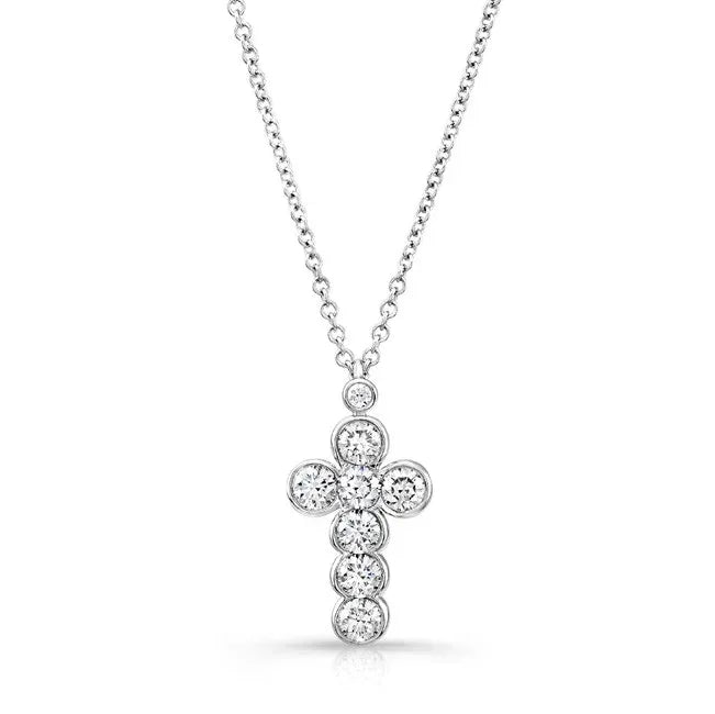 Cross pendant necklace with bezel set round brilliant diamonds in 18kt white gold.