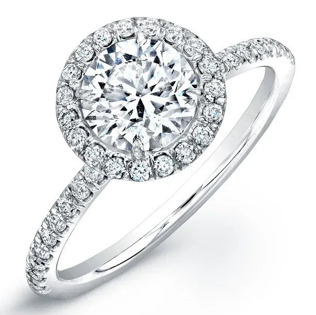 Halo ring with Round brilliant center accented with white diamond melee in 18kt white gold.
