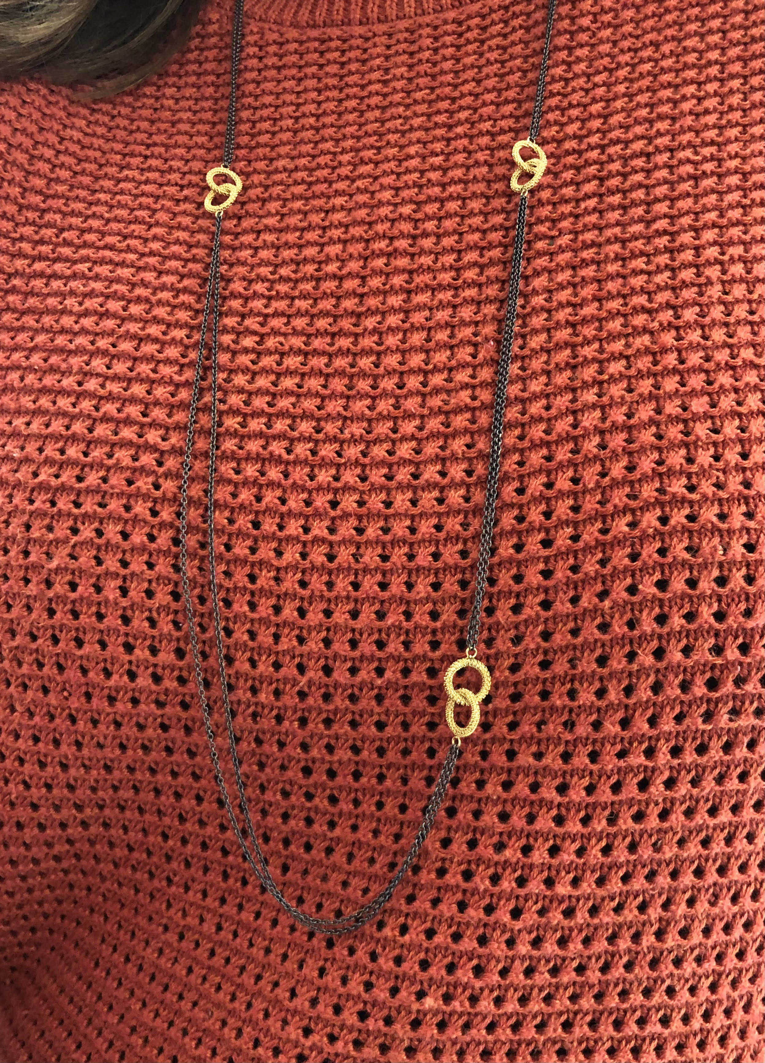 18 karat yellow gold and oxidized silver interlocking circle necklace designed and created by Amali. The necklace features three stations of interlocking yellow gold circles attached to double lengths of oxidized silver chain. The necklace measures 36 inches in length. The style reference for the necklace is N-1758.
