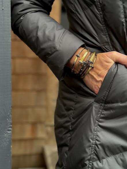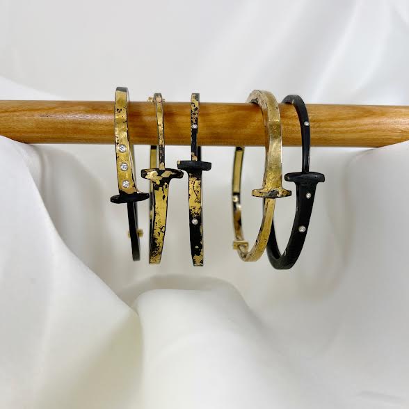 18 karat yellow gold and diamond iron ‘Nine Stone’ nail bracelet hand forged and fabricated by Pat Flynn, Inc. The bracelet has a hand forged iron nail structure and has nine scattered flush set round brilliant cut diamonds. The diamonds are G-H color, VS clarity and together weigh 0.07 carats. There is an 18 karat yellow gold hinge and name plate on the inner bottom portion of the bracelet. The bracelet features a blackened patina and the style number is NB14-31.