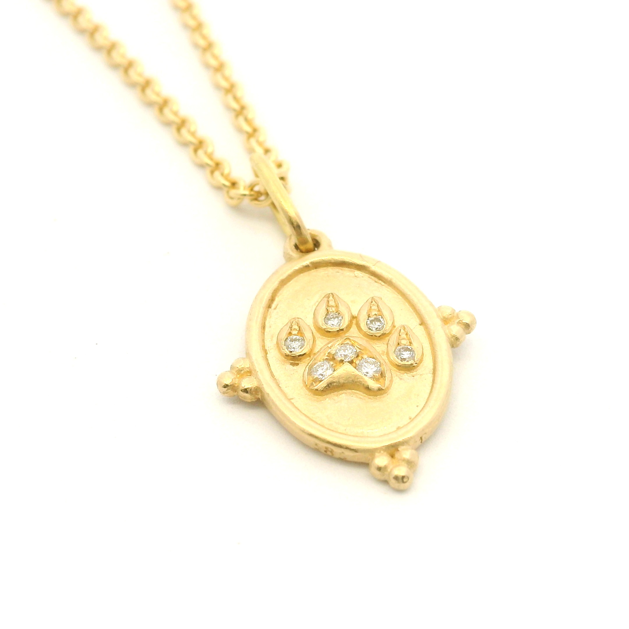 14 karat yellow gold paw charm designed and created by Erica Molinari. The charm features a paw print, with seven prong set diamonds, together weighing .071cts. The charm has “Love” engraved in Italian on the back. Style number CO171-3