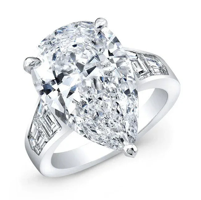 Pear shape diamond ring with trapezoid & bullet cut diamonds on the side in platinum.