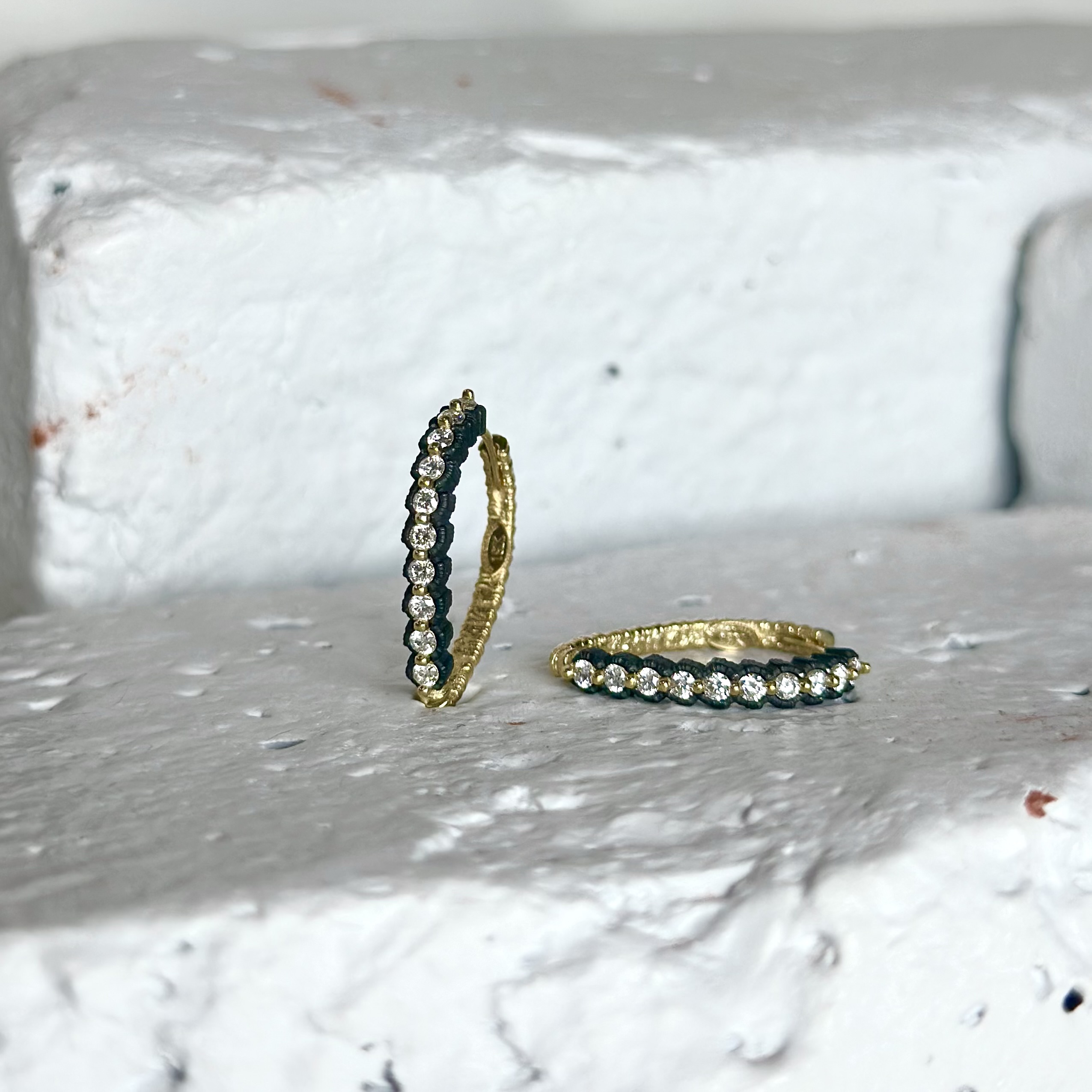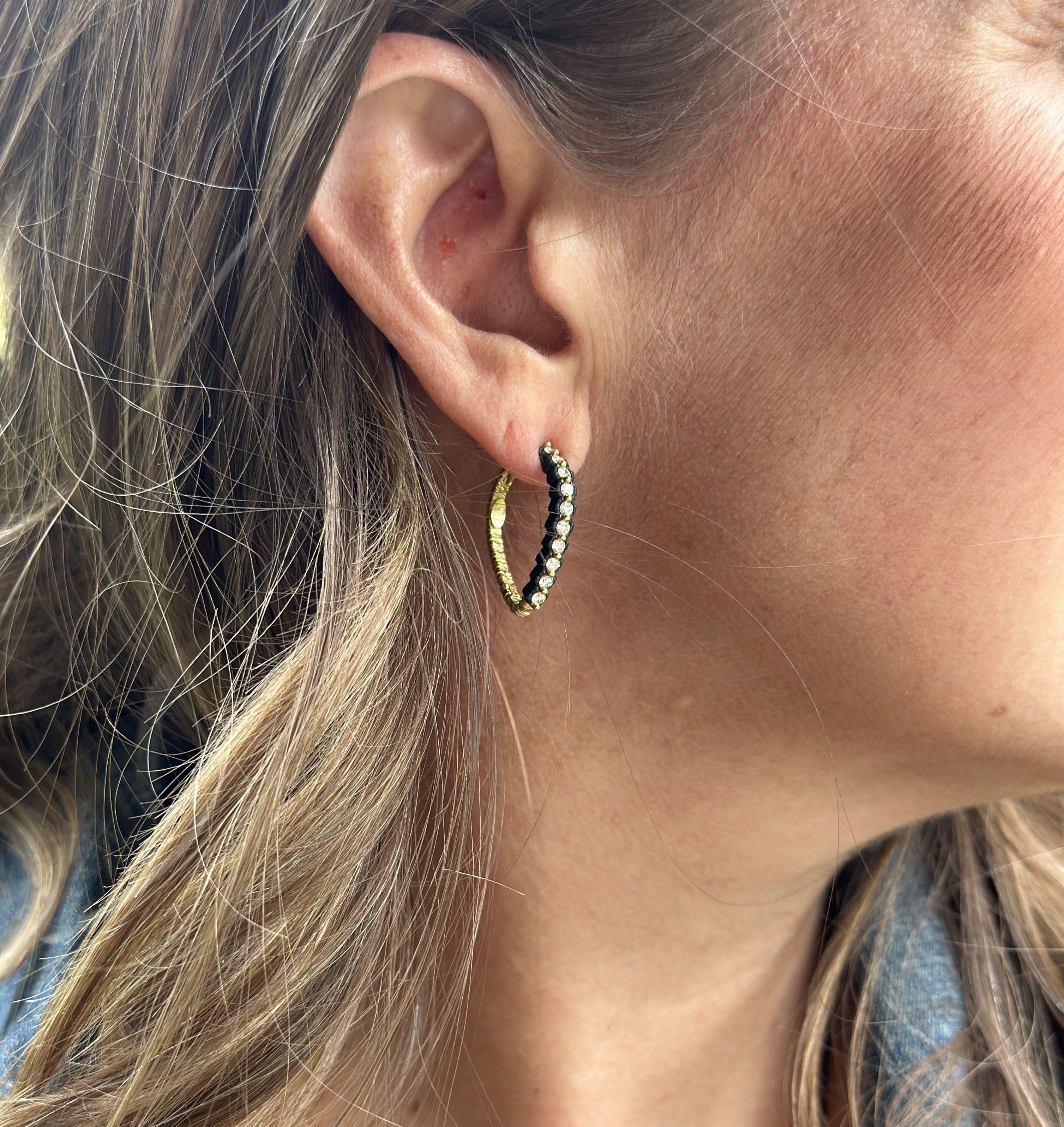 18 karat yellow gold and cobalt chrome diamond snap hoops designed and created by Sarah Graham Metalsmithing. The earrings feature round brilliant cut diamonds prong set along the front of pear-shaped snap hoop. The diamonds are set with a shared prong between each pair of diamonds. Together, the diamonds weigh 0.60 carats. The prong set diamonds are set against a cobalt chrome scalloped front. The back of the hinged hoop is textured 18 karat gold. The post is curved and reaches from front to back to snap into place. Style reference 72E1-1-1GS.