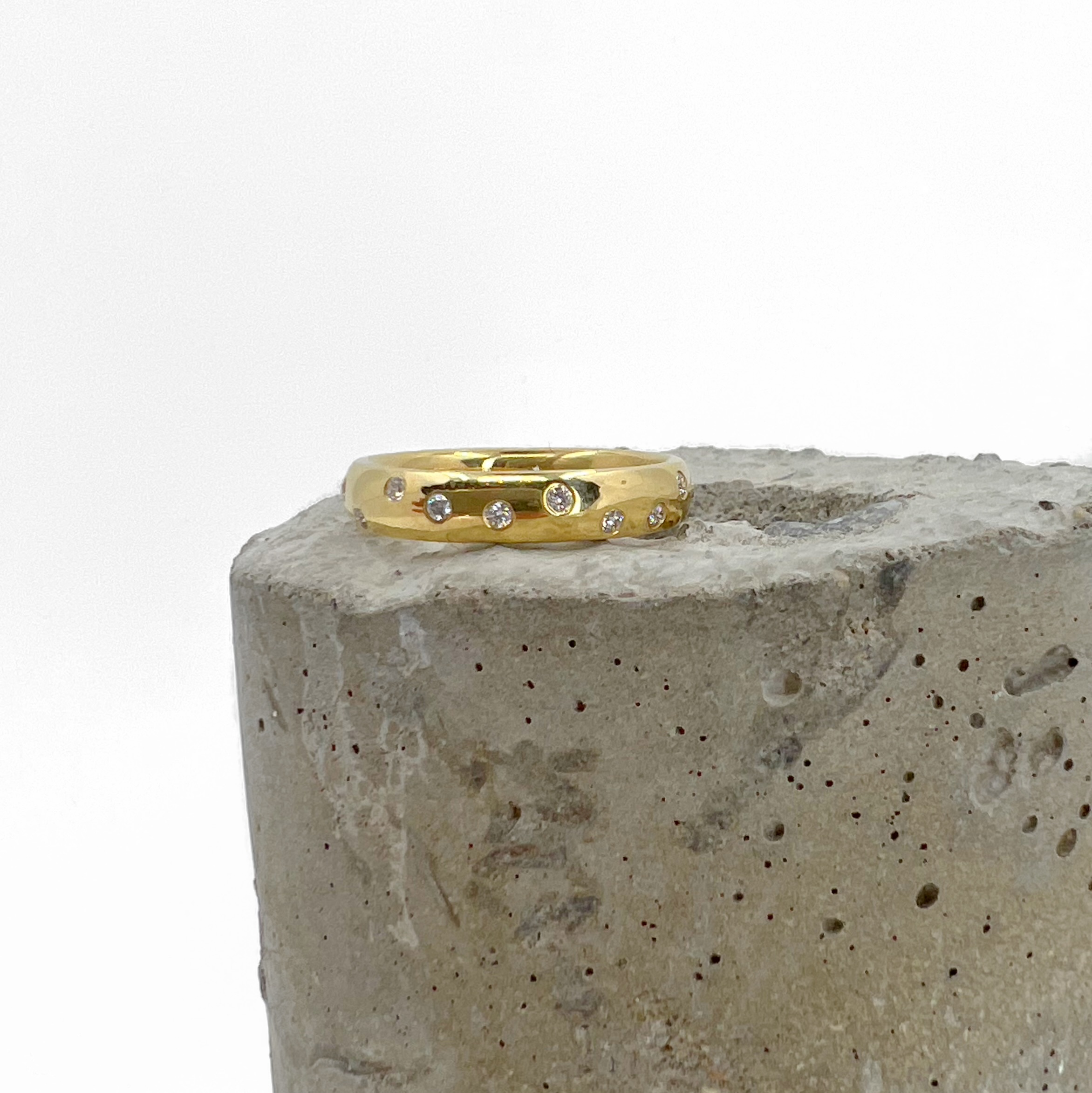 18 karat yellow gold scattered diamond band designed and created by Von Bargen’s. The ring is a 4mm wide domed comfort fit band with flush set round brilliant cut diamonds set in a scattered pattern. There are a total of 20 diamonds that together weigh 0.26 carats. The diamonds are D to F in color and VS in clarity. The ring has a high polished finish. Style reference C4R-Scatter.