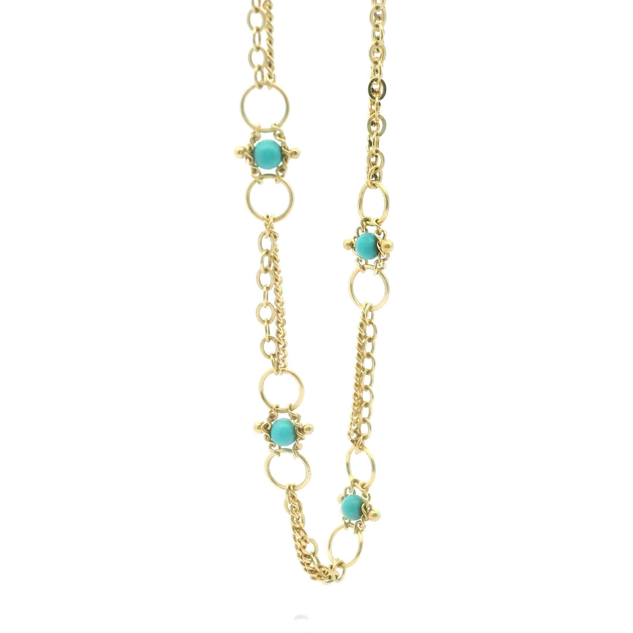 Yellow gold and turquiose “Whisper” bracelet designed and created by Amali. The bracelet features 6 turquoise stones set in stations among Amali’s signature 18 k yellow gold weave. The bracelet is finished in a lobster claw clasp and in an overall high polish. Style number is B-1615-TQ