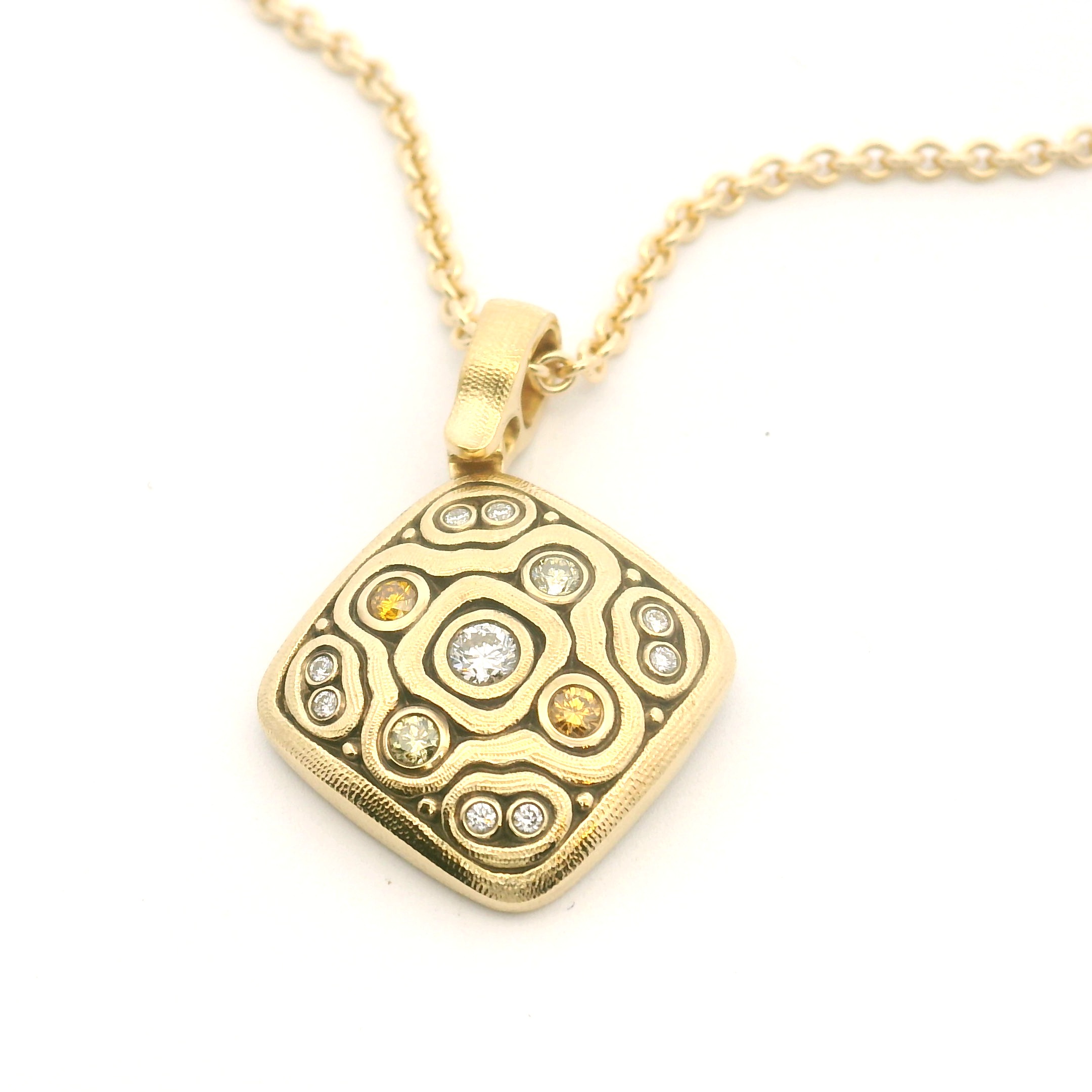 18 karat yellow gold and diamond “Cushion” pendant designed and created by Alex Sepkus. The pendant is a soft kite shape with a mix of round brilliant cut white and natural color diamonds. There are a total of 9 round brilliant cut diamonds F/VVS that together weigh 0.15 carat and 4 natural color diamonds that have a total weight of 0.12 carat. Each of the diamonds is bezel set within the carved curvilinear pattern. The pendant is finished with Alex’s signature hand texture and applied oxidation. Style number M-148DC