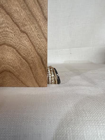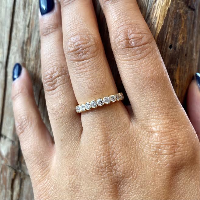 18 karat yellow gold and diamond half-bezel band designed and created by Mark Patterson. The band features round brilliant cut diamonds set in half bezels around the entire band. The diamonds total 1.51 carats in weight and are all F-G in color and VS in clarity. The ring is finished in high polish. The style number is R1068YD.