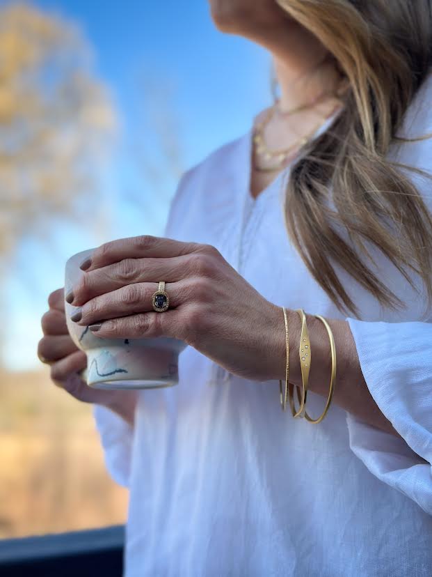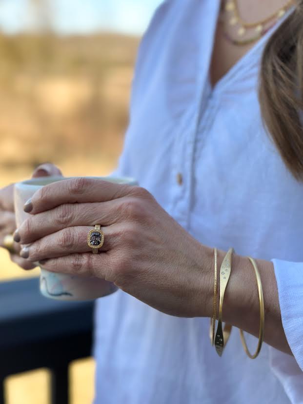 18 karat yellow gold, gray spinel and diamond ring designed and created by Adel Chefridi. The ring features a Von Bargen’s hand selected natural gray spinel that is an elongated cushion shape. It measures 8.8x7x5.5mm and weighs 2.71 carats. It is set in a bezel that is accented with flush set round brilliant cut diamonds. The ring shank has three round brilliant cut diamonds on each side. The accent diamonds are detailed with hand engraving. The accent diamonds together weigh 0.06 carats (G/VS). The entire ring is finished in Adel’s signature matte finish. The ring is a size 6.