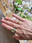 18 karat yellow gold "Sea Creatures" Band designed and created by Alex Sepkus. The band measures 4.5mm wide, and features carved swirling patters. The carvings are accentuated with Alex's signature hand-stippling and an applied oxidation. Style number R-156M