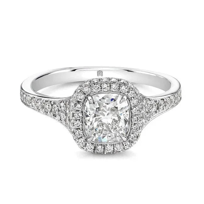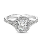 Halo ring with cushion brilliant diamond accented with white diamond melee in 18kt white gold.
