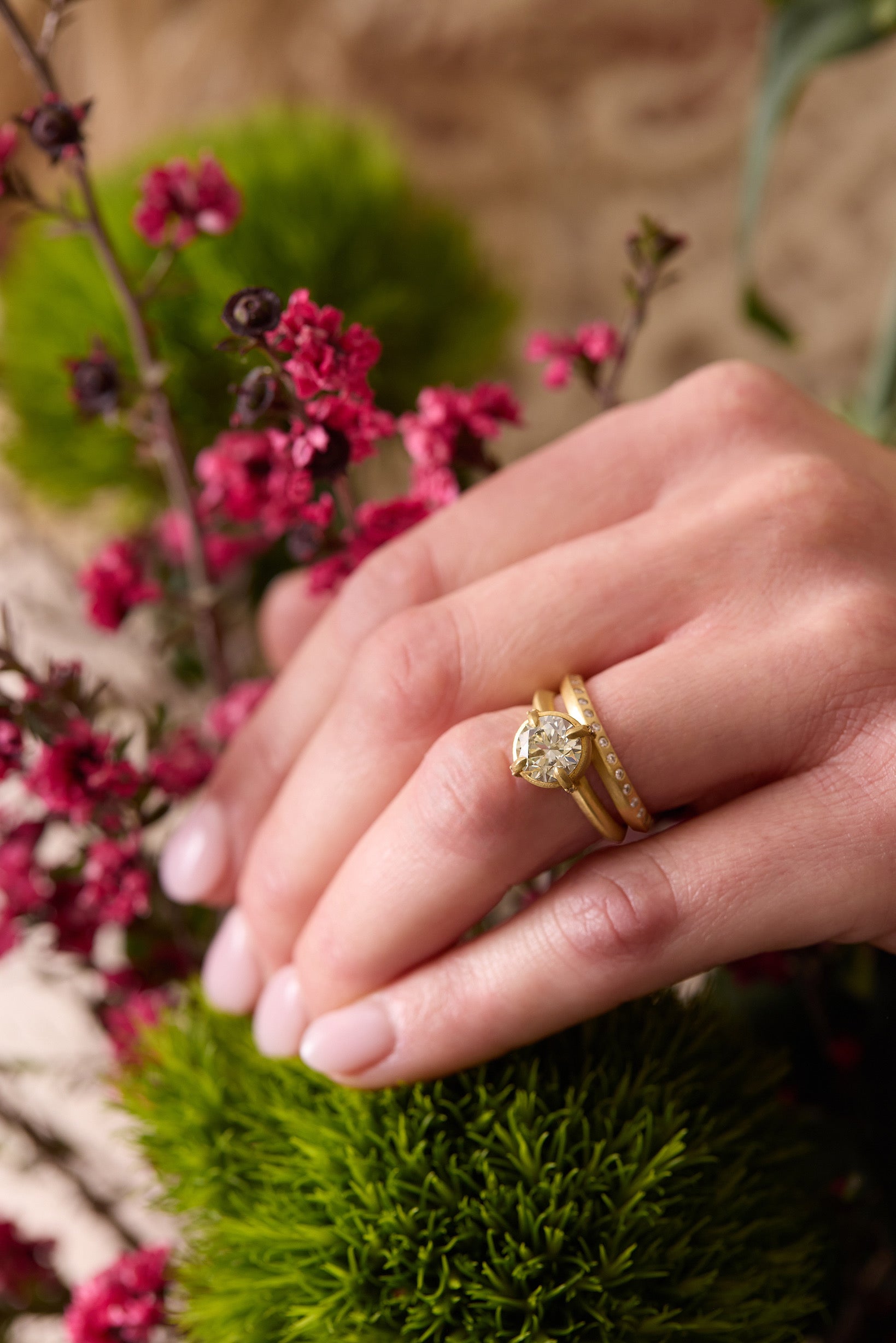 One 18k yellow gold diamond band designed by Ali and created by Von Bargen's. The ring features 0.18ctw of round brilliant cut diamonds flush set in an eternity around 1/2 of a knife edge band. The ring has a directional brush finish and is a finger size 6.