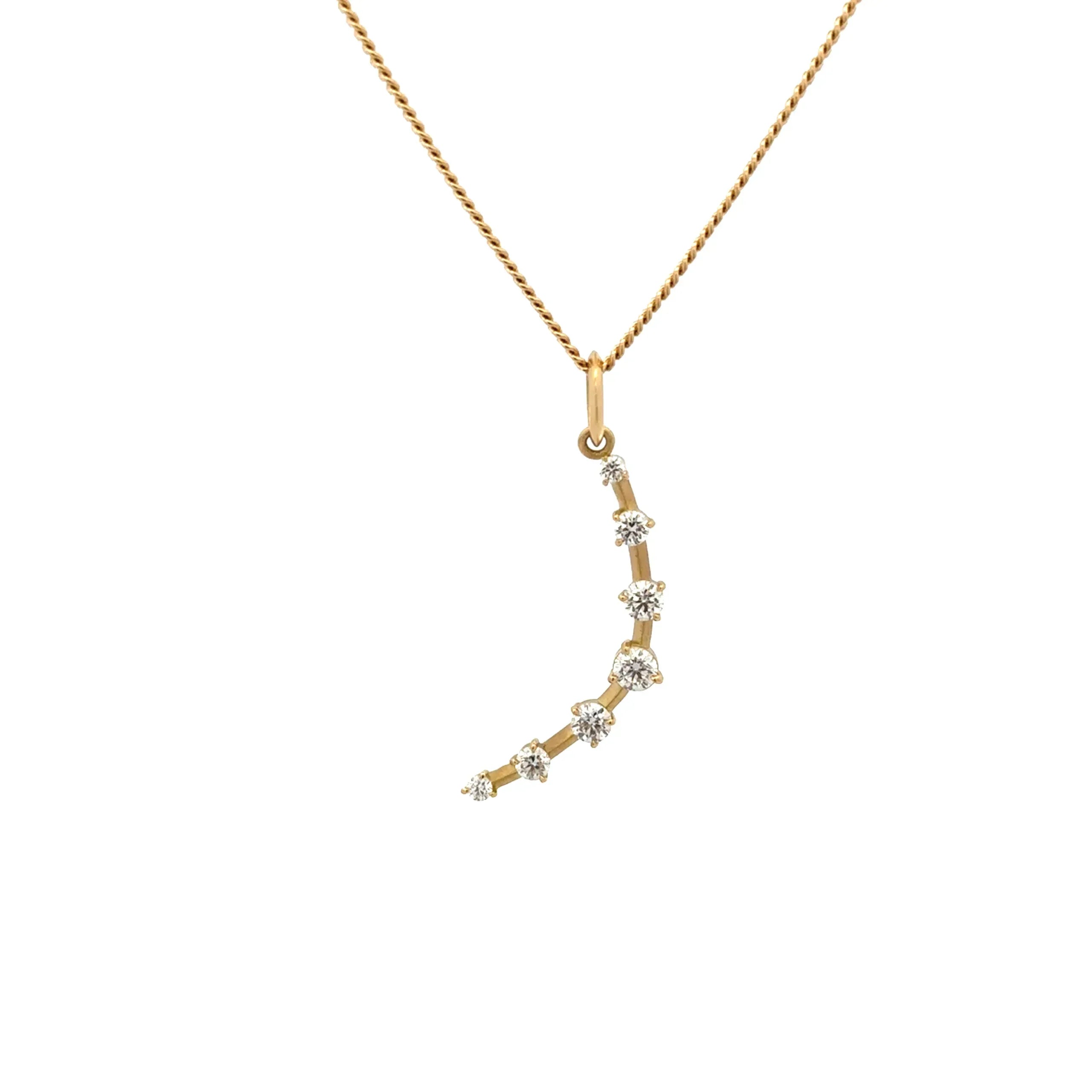Yellow Gold and Diamond Crescent Charm designed and handcrafted by Jade Trau. The 1" Crescent charm features 7 round brilliant cut diamonds alternating in size with a total carat weight of 0.56 carats. The diamonds are F/G in color and VS2 in clarity. The crescent charm is a modern take on the half moon celestial motif. The charm is finished in a matte finish. Style JT6007CH