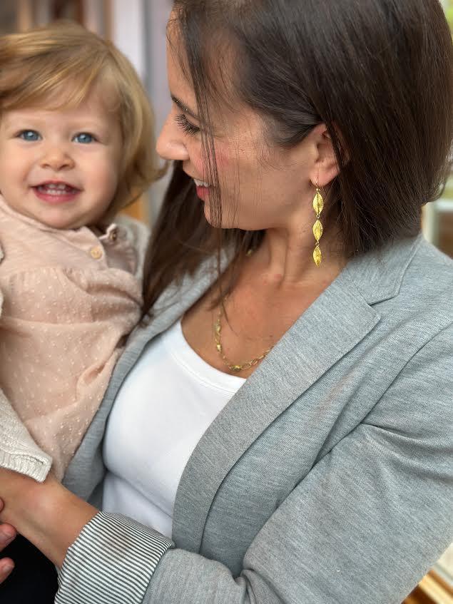 Yellow gold triple twist cylinder drop earrings designed and created by Petra Class. The earrings feature 22 karat yellow gold triple twist drop dangle earrings on a wire. The earrings are finished in Petra Class's signature brush finish. Style ECGoldTripleTwist